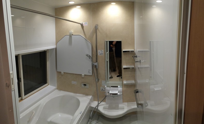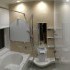 ノーリツ ユパティオの全面鏡面壁へオプションで変更し、収納やスライドバーもメタル調へ変更いたしました。