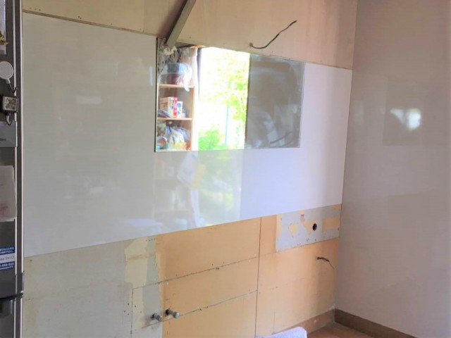 工事中は、まだキッチン本体が付く前に、キッチンパネルを壁に貼っただけの状態をご覧になって、