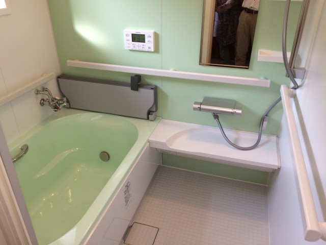 0.75坪にダウンサイズしたシステムバスですが、壁の全方向に手すりがついたサポートパックでご高齢の方に安心して使えるお風呂になっています。