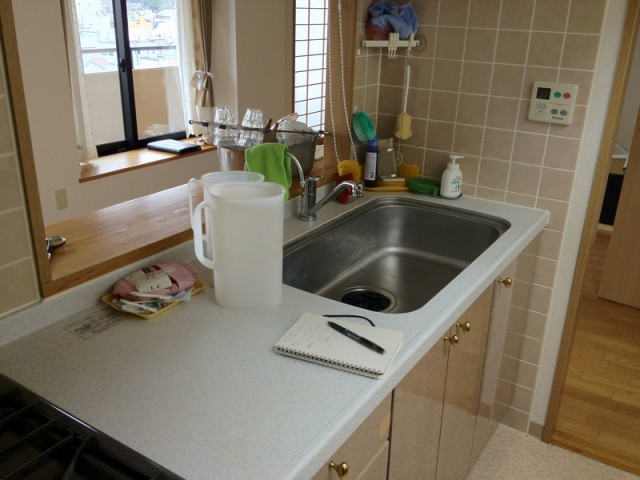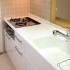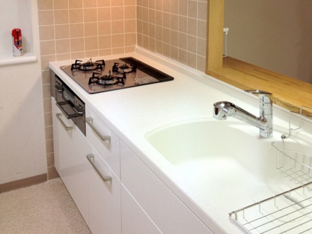 今回はスライド式の収納の上、トップもシンクもヤマハの人造大理石を使った透明感のあるキッチンになりました。