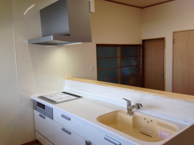 壁付けI型のキッチンから対面式へ。奥様がお料理をしながら、ゆっくりテレビも楽しめる作りにいたしました。