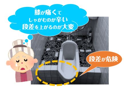 和式のトイレは、膝や腰が痛くて、しゃがむのが辛い。