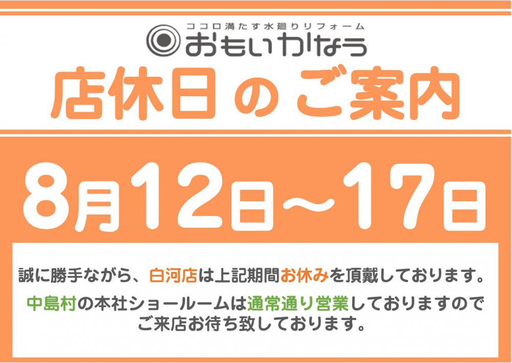 "白河ショールーム店 のみ" お盆休みを頂戴いたします。