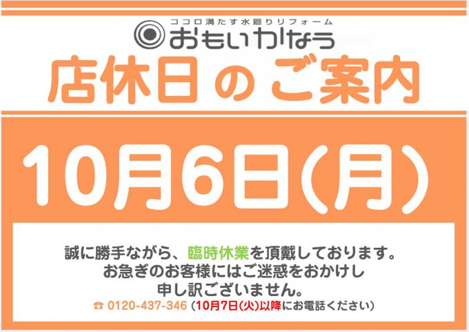 10月6日(月) 休業のお知らせ